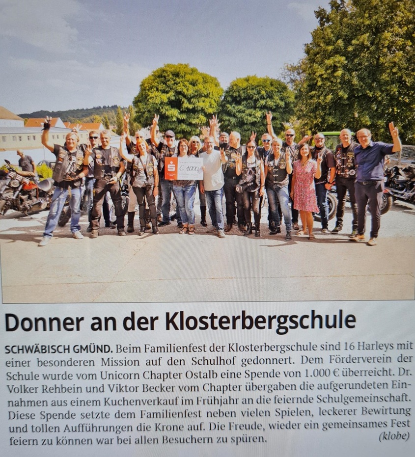 Schwäbisch Gmünd. Wir freuen uns sehr, auch in diesem Jahr wieder die Arbeit des " Bunten Kreis Schwäbisch Gmünd e.V." mit einer Spende unterstützen zu können. Gemeinsam mit dem Unicorn Chapter Ostalb konnten heute zwei Schecks mit einem Gesamtbetrag von 3500 € an Silvia Schmidt-Motschenbacher vom Bunten Kreis übergeben werden. Herzlichen Dank an alle für die Unterstützung und einen riesigen Dank an den Bunten Kreis für ihre tolle Arbeit.