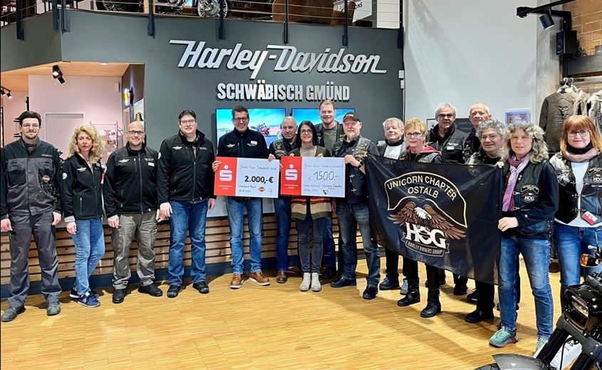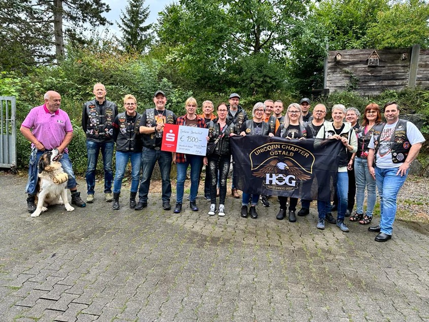 Aalen. Mit einer besonderen Mission haben sich am regnerischen Samstag, 29.07.2023 16 Mitglieder des Unicorn Chapter Ostalb beim Tierheim Dreherhof eingefunden. Ohne ihre Harleys, dafür mit viel Sonne im Herzen waren die Biker mit einem Spendenscheck, den sie unter anderem aus Kuchenverkauf bei Veranstaltungen des Harley-Davidson-Händlers in Schwäbisch Gmünd erwirtschaftet hatten, beim Dreherhof eingetroffen. Der Vize Director Wolfgang Ring überreichte den Spendenscheck in Höhe von 1.500,00€ für die explosiv gestiegenen Tierarztkosten der Tierheimbewohner. Mit Butterbrezeln und Kaffee wurden die Unicorns vom Dreherhof-Team empfangen.